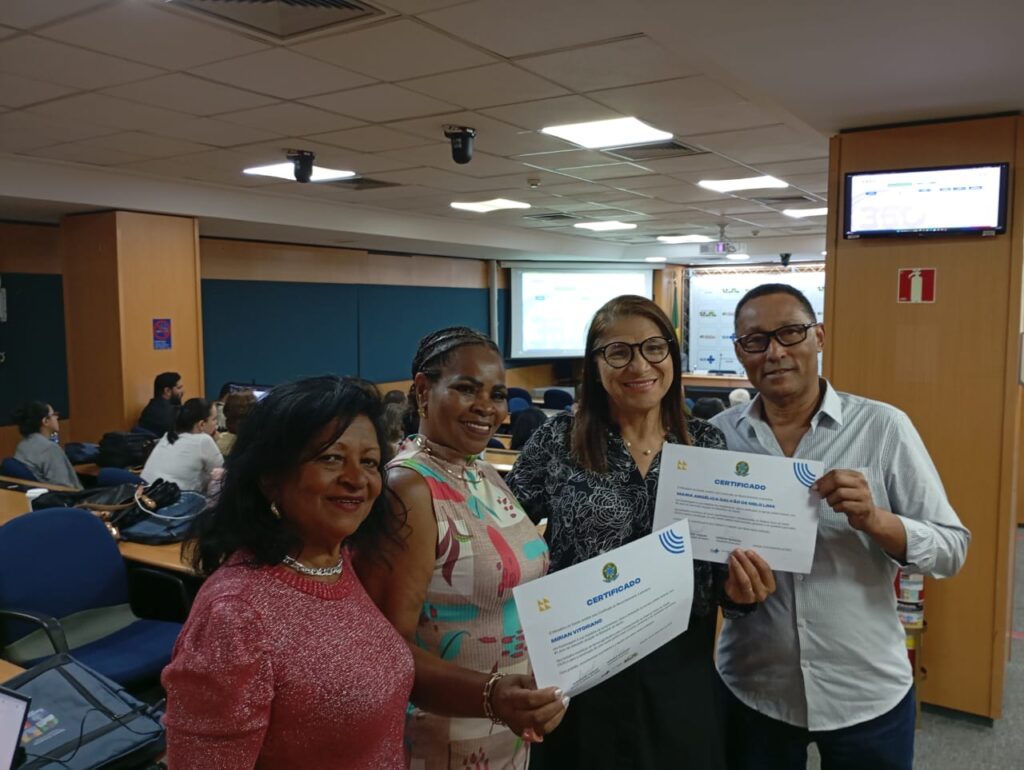 Da esquerda para a direita, as servidoras Valdiva Soares, Miriam Vitoriano e Maria Angélica Galvão, ao lado do diretor do Sindprev/DF, João Torquato