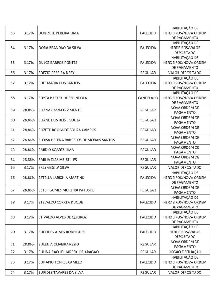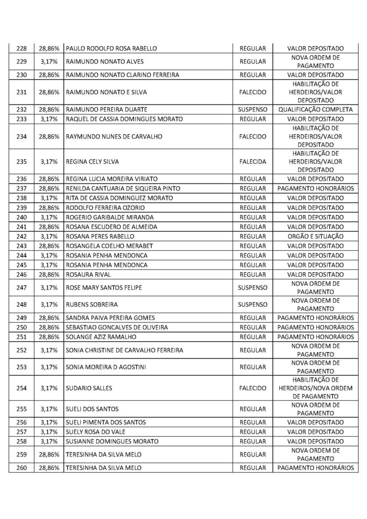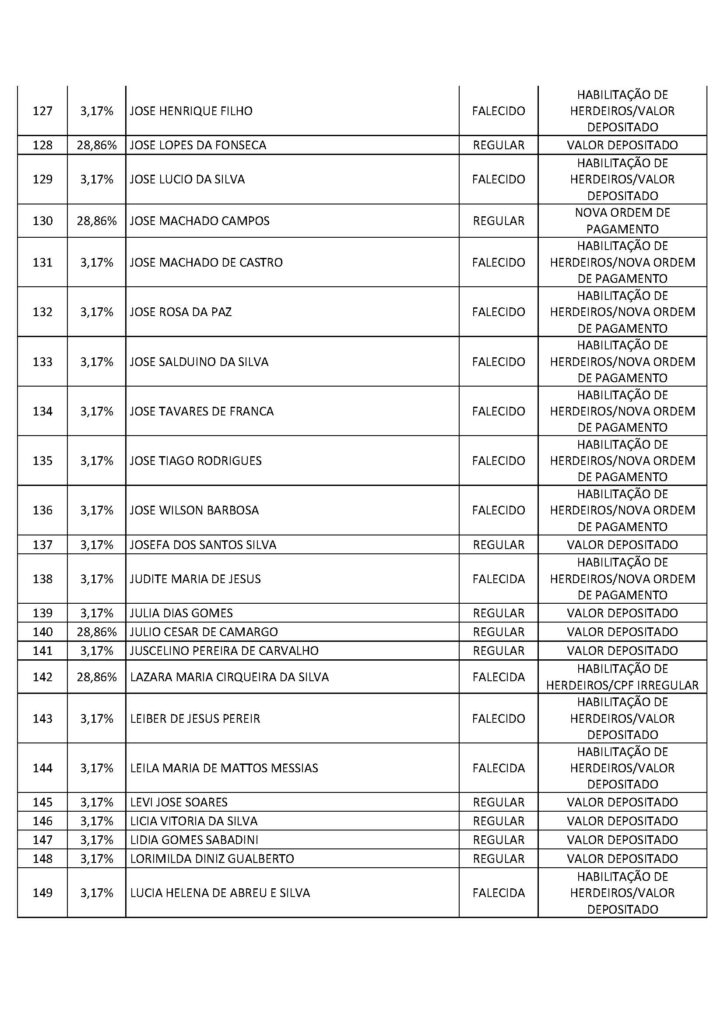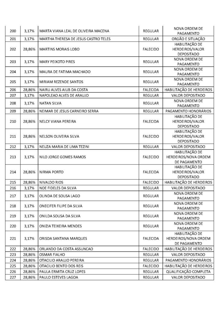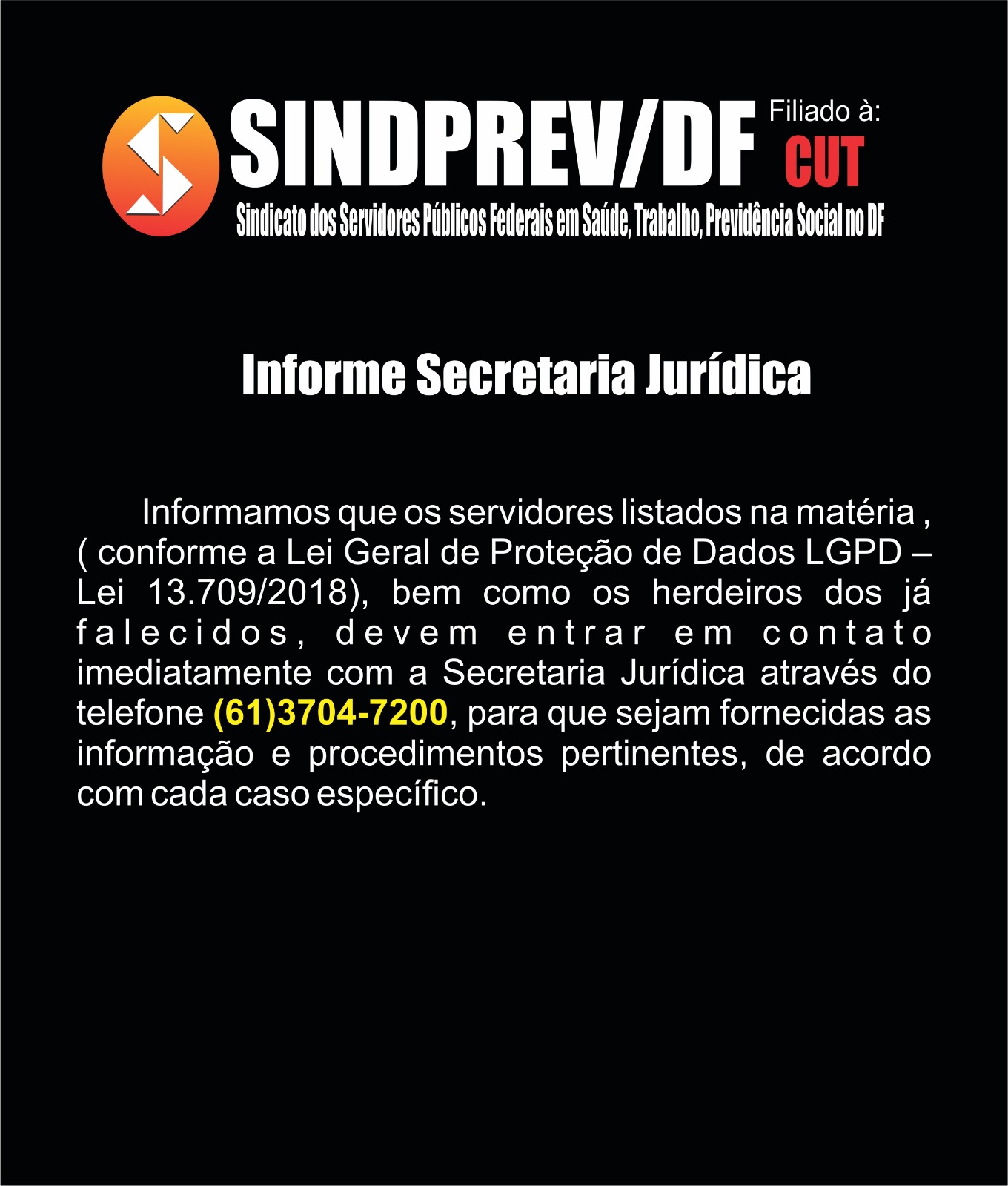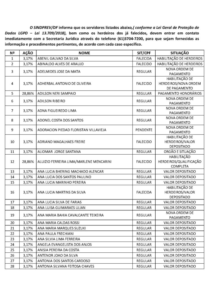 O Sindicato dos Trabalhadores em Saúde, Trabalho, Previdência e Assistência Social no Distrito Federal (Sindprev/DF), por intermédio de sua Assessoria Jurídica, conforme a Lei Geral de Proteção de Dados (LGPD) (Lei nº 13.709/2018), informa que os servidores listados a seguir, bem como os herdeiros dos falecidos, devem entrar em contato imediatamente com a Secretaria Jurídica do Sindprev/DF, pelo telefone (61) 3704-7200, para que lhes sejam fornecidas as informações e lhes sejam informados os procedimentos pertinentes a cada interessado específico.