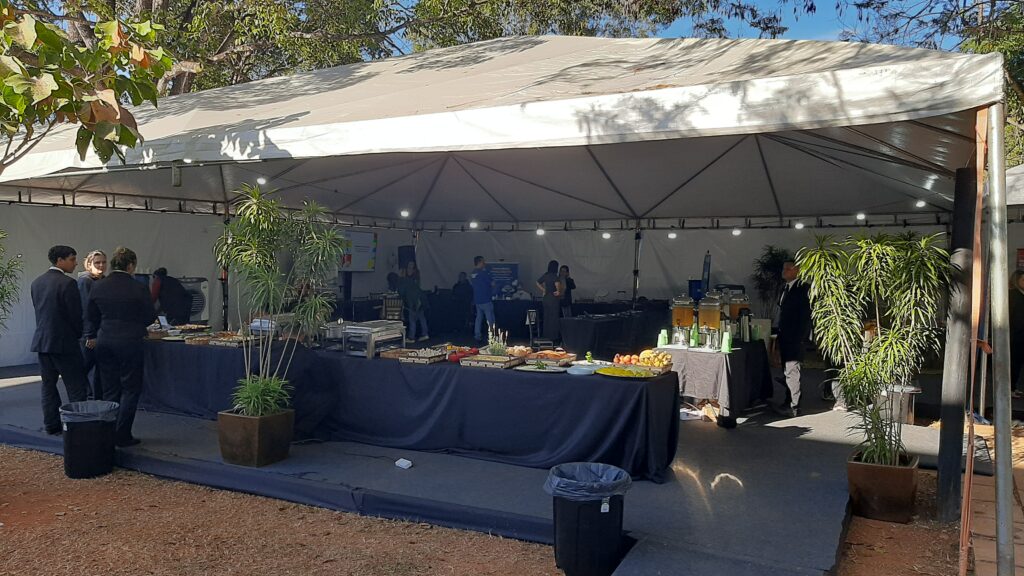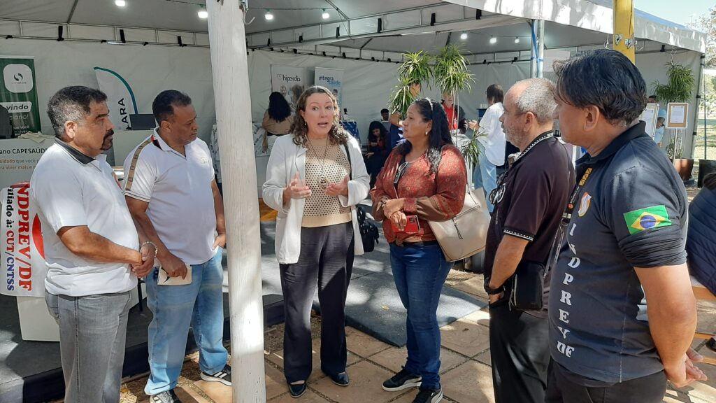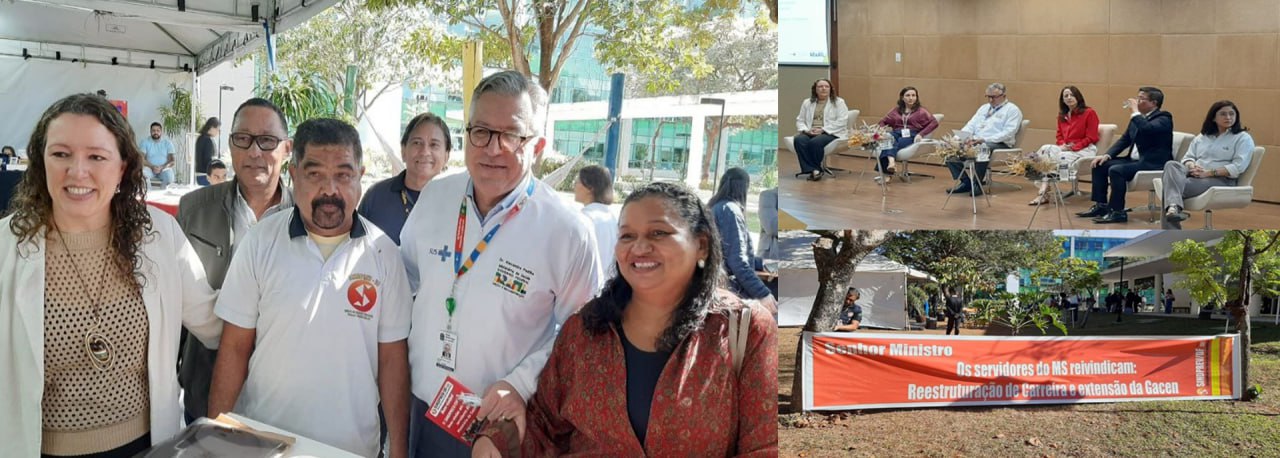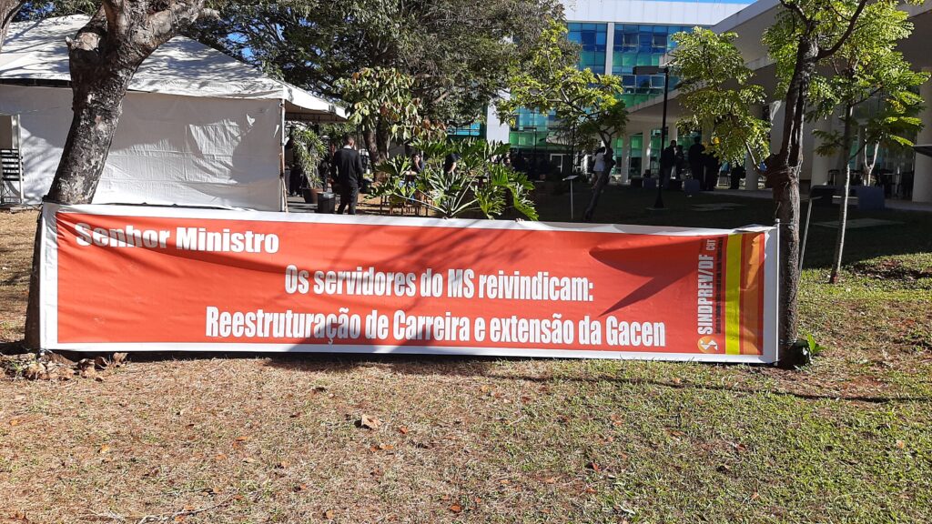 Antes da chegada do ministro Padilha à tenda do evento, a coordenadora Etel Matielo compareceu ao estande do Sindprev/DF e se apresentou aos representantes sindicais. Na oportunidade, em relação à reivindicação exposta na faixa do sindicato, Etel Matielo explicou brevemente aos sindicalistas que a extensão da Gacen não depende de uma portaria do MS, uma vez que carece da promulgação de uma lei federal. A coordenadora também disse que os recursos da Gacen são uma atribuição do Ministério da Gestão e da Inovação em Serviços Públicos (MGI) e que os representantes tanto do MS quanto do MGI estariam à disposição dos representantes sindicais para debater sobre a extensão do benefício em uma ocasião mais propícia.